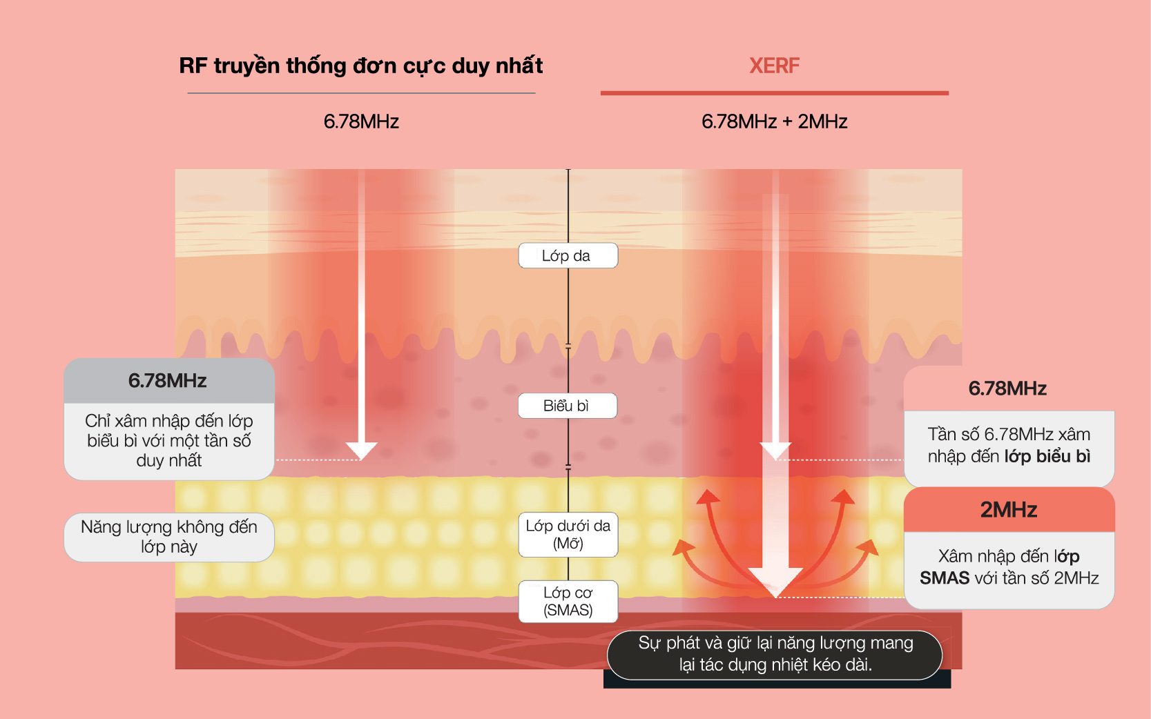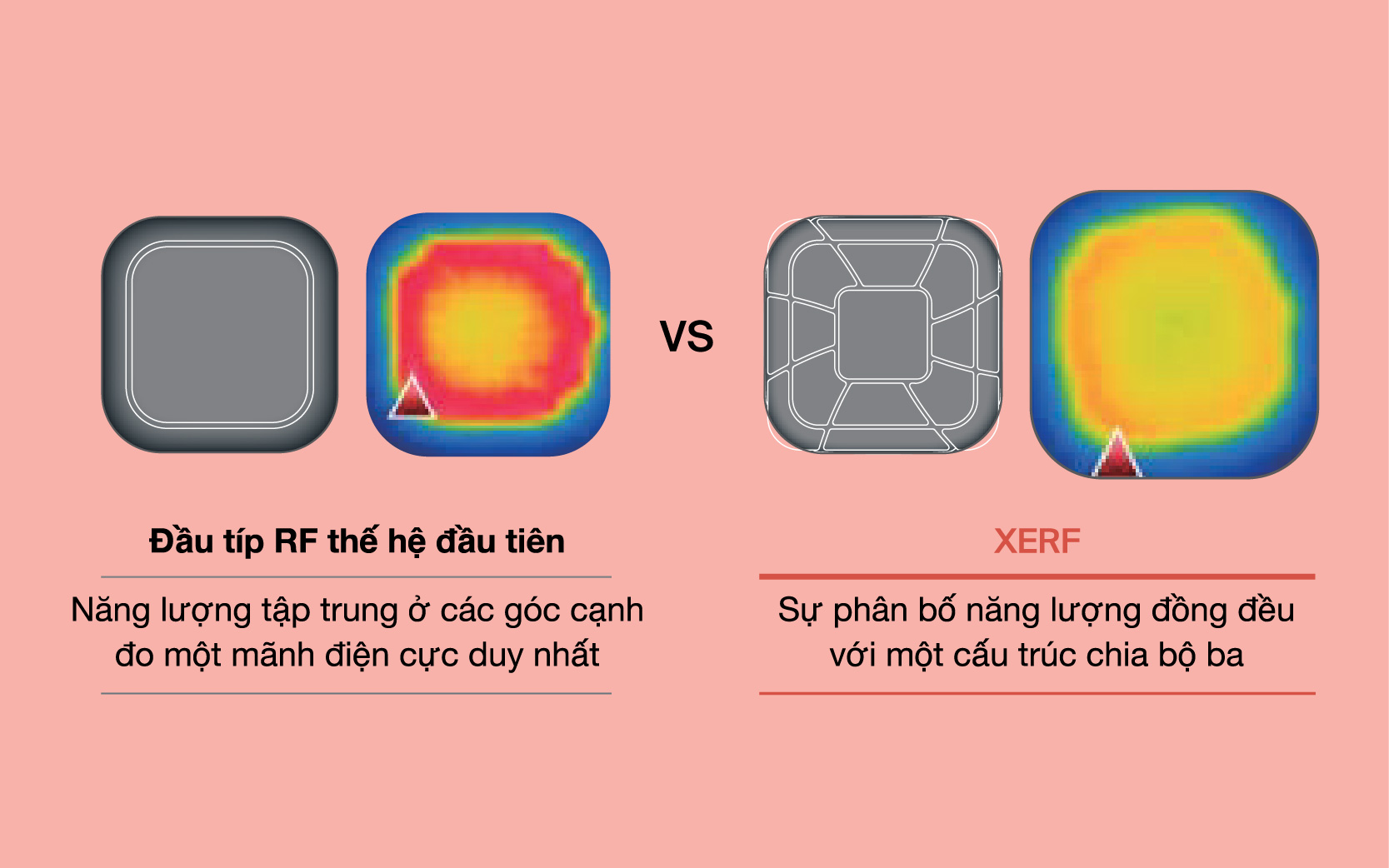Khác biệt hoàn toàn so với các công nghệ RF thông thường, XERF™ có khả năng truyền năng lượng sâu hơn, tác động đồng thời đến cả 3 tầng da – nông, trung và sâu (bao gồm cả lớp SMAS) – nơi khởi nguồn của quá trình lão hóa. Nhờ đó, XERF™ không chỉ cải thiện độ săn chắc và độ đàn hồi, mà còn tái cấu trúc làn da từ bên trong, mang lại kết quả rõ rệt, được chứng minh bằng khoa học, và trải nghiệm điều trị nhẹ nhàng, thoải mái tối đa.