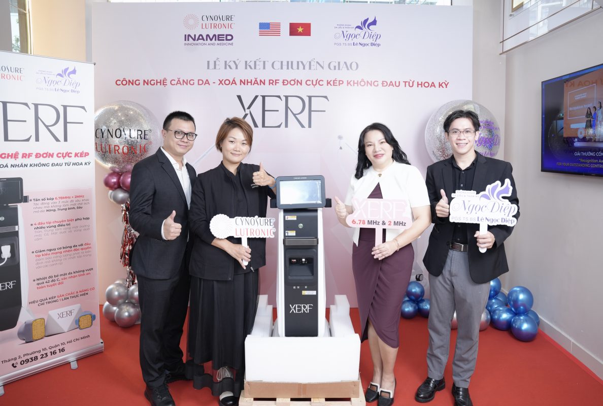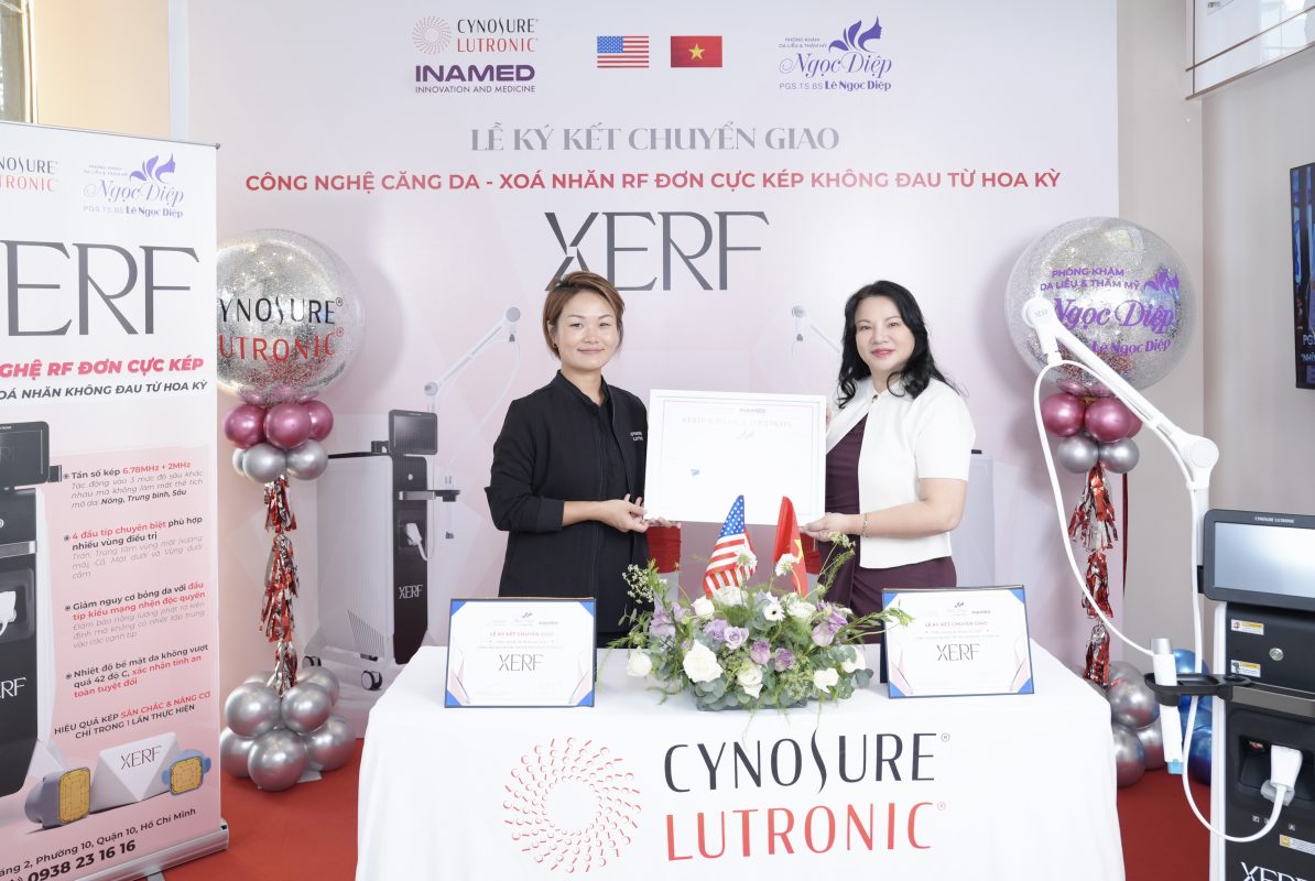 PGS.TS.BS Lê Ngọc Diệp – Người sáng lập, bác sĩ chuyên môn của Phòng Khám Da Liễu và Thẩm Mỹ PGS.TS.BS Lê Ngọc Diệp, đồng thời là KOL và bác sĩ trainer của Cynosure tại Việt Nam – đã chính thức ký kết chuyển giao công nghệ XERF với đại diện hãng Cynosure Lutronic (Hoa Kỳ), bà Grace Tsoi – Quản lý Đào tạo Lâm sàng khu vực Châu Á – Thái Bình Dương.